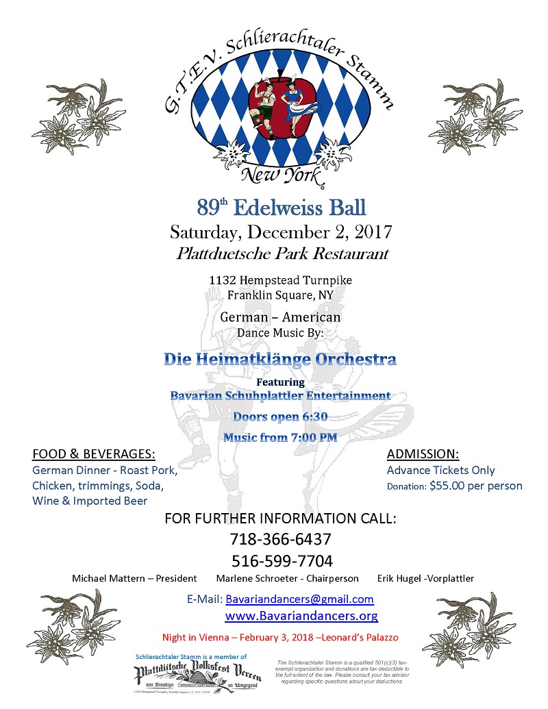 The GTEV Schlierachtaler Stamm is proud to announce their 89th Edelweiss Ball to be held on Saturday, December 2, 2017 at the Plattduetsch Park Restaurant in Franklin Square, New York.