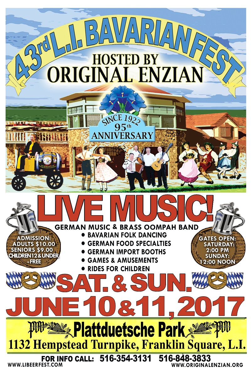 SVV Original Enzian cordially invites you to join us at our 43rd Annual Long Island Bavaria Festival on the weekend of June 10-11 at Plattduetsche Park Restaurant, 1132 Hempstead Tpke, Franklin Square, NY.  Enjoy live music in an Oktoberfest atmosphere including Schuhplattler performances by our adult and Kindergruppe, German food specialties, German import booths, as well as games, amusement, and rides for the kids. Live music by the Foehrer Musik Freunde (authentic German brass band), Spitze (all the way from Florida), and Blaskapelle Long Island will entertain the crowds on both Saturday and Sunday. Doors open Saturday at 2 pm and Sunday at 12 noon. Please see our ad and flyer below or at www.libeerfest.com. We look forward to seeing you!  --George Mueller, SVV Original Enzian, Vice President & Events Coordinator