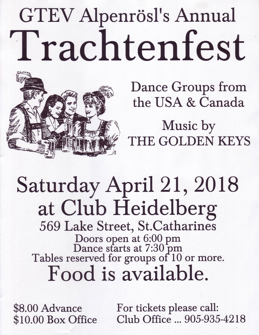 The time for GTEV Alpenrösl's annual Trachtenfest in St. Catharines, Ontario, is just three months away--Saturday, April 21. Every year the Verein welcomes Trachtler and Trachtlerinnen from the US and Canada to a fun-filled evening with lots of dancing, good music, good refreshment, and Gemütlichkeit at the beautiful Club Heidelberg. See the flyer for more detail on time, place, and how to make reservations.