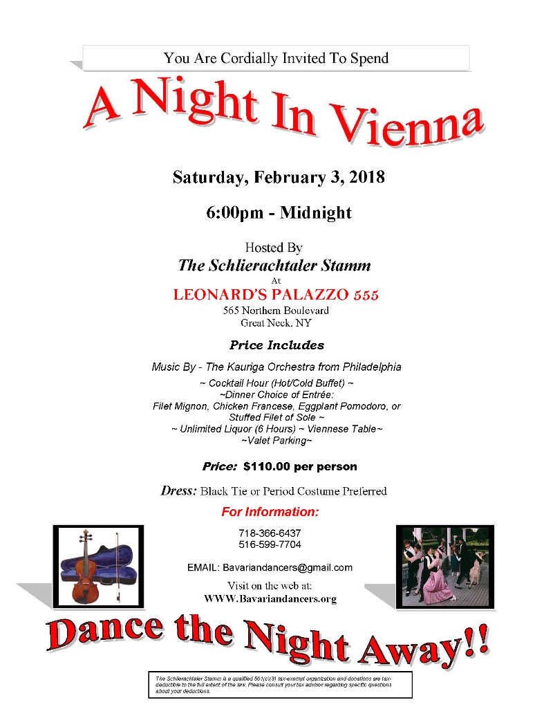 The Schlierachtaler Stamm of Franklin Square, NY, invites you to their annual "A Night in Vienna." Saturday, Feb. 3, 6 pm-midnight, you can dance the night away at Leonard's Palazzo in Great Neck. See the flyer for details and how to buy tickets.
