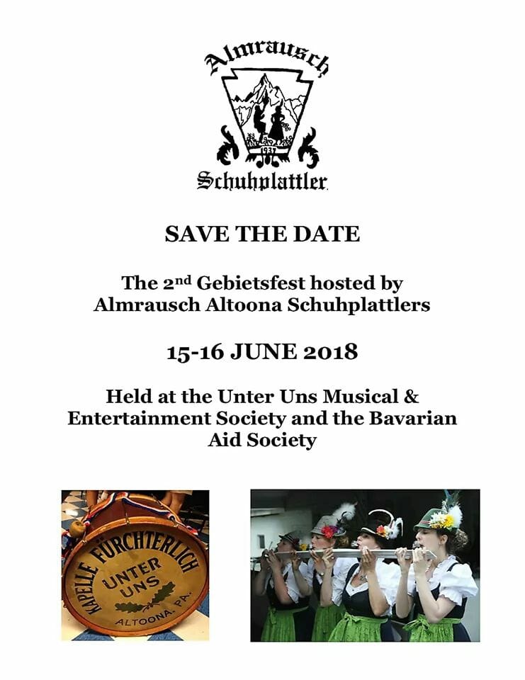 The second Vier Länder Gebietsfest will be hosted by the Almrausch Schuhplattler of Altoona, Pennsylvania, on June 15-16, 2018. See the flyer for more info and be sure to save the dates on your calendar. Email Shari Oberneder at smoplustwo@yahoo.com for more information. As the date gets closer, the post will be updated.