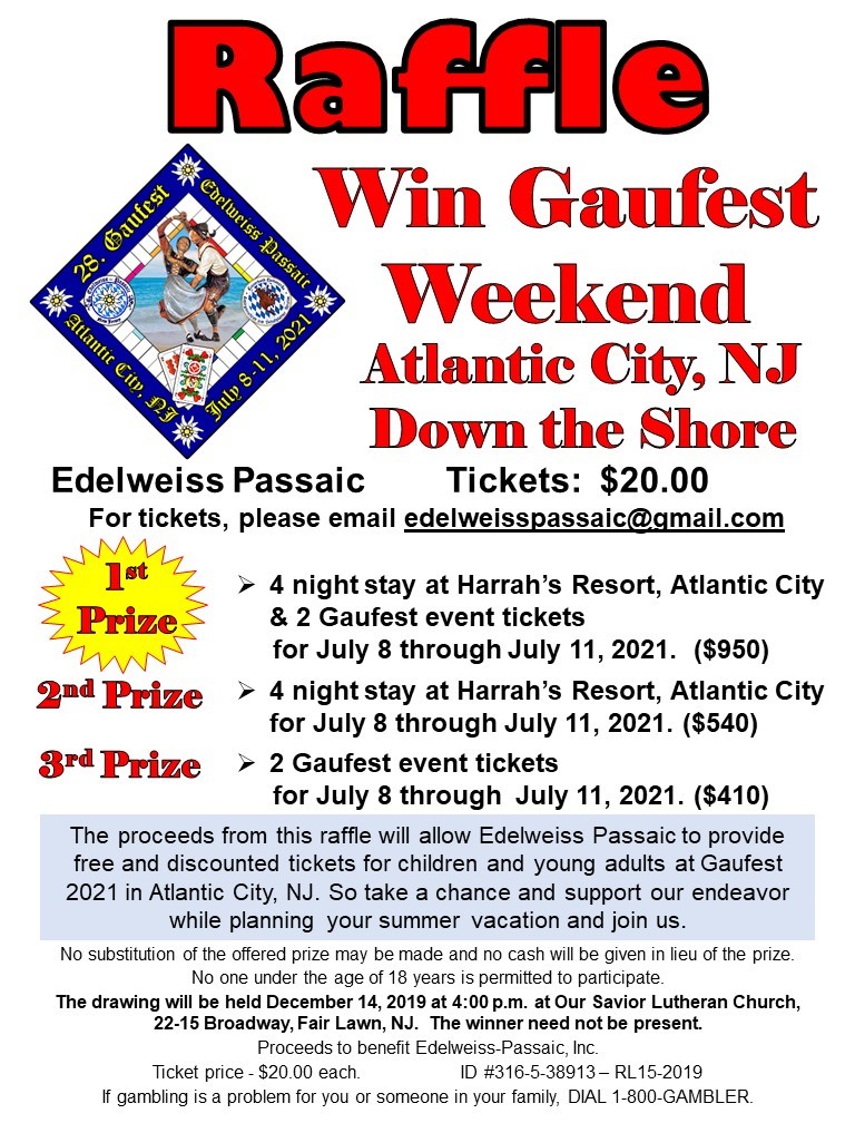 Our 2021 Gaufest host, Edelweiss Passaic, is holding a raffle to raise money to be able to offer free and discounted tickets to children and young adults. But anyone who buys a raffle ticket also gets the opportunity to win free tickets for themselves or even a free hotel stay for the Gaufest! Drawing is December 14, 2019. See the flyer below for details. (Void where prohibited.)