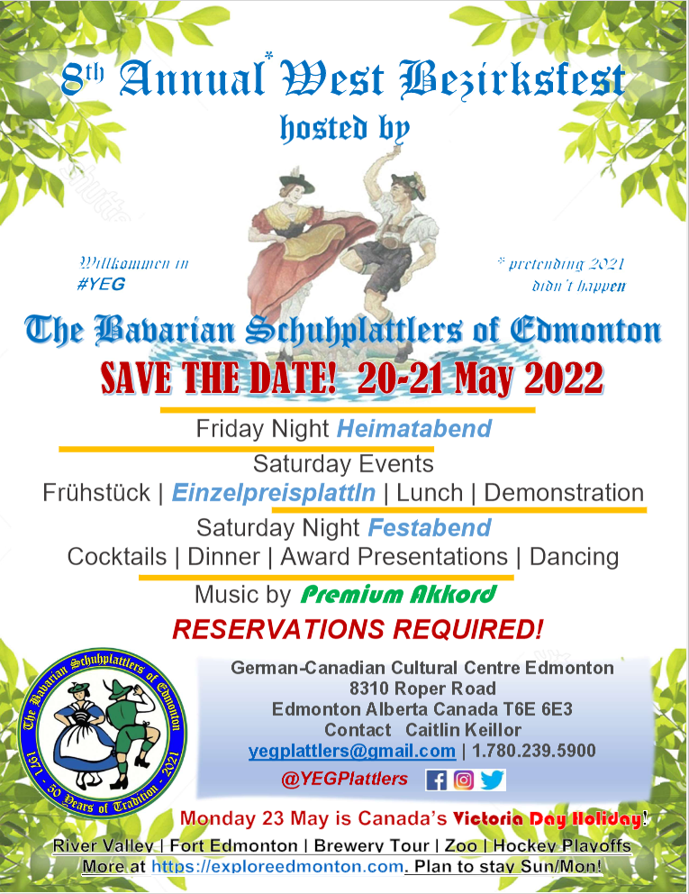 The Bavarian Schuhplattlers of Edmonton in Alberta, Canada, will be hosting the 2022 West Bezirksfest on May 20-22, 2022. Mark your calendars! See more information in the flyer.