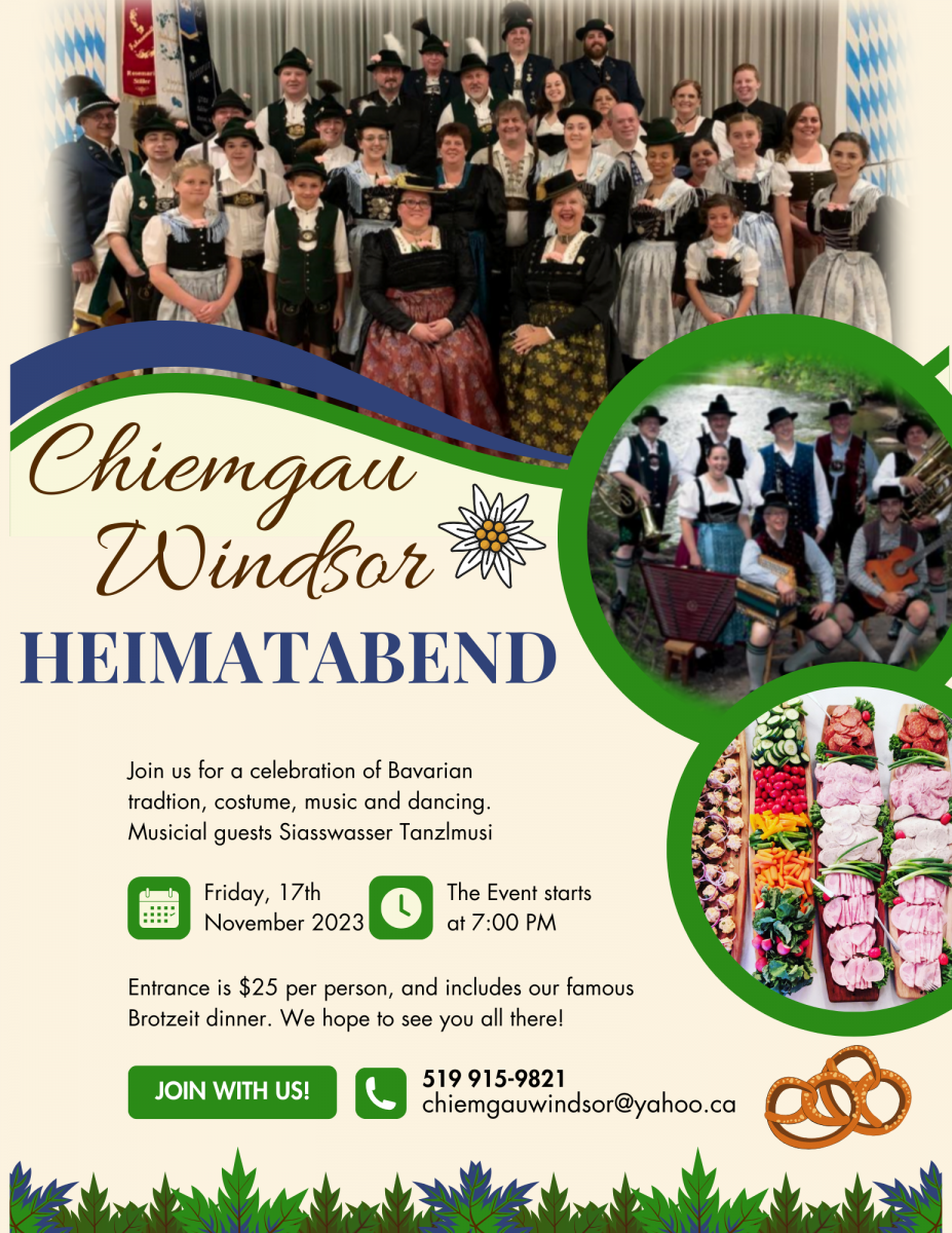 GTEV Chiemgau Windsor, Ontario, is hosting a Heimatabend on Friday, Nov. 17, and would love to have you join them. It will be held at their Vereinsheim, Heimat Windsor, and the $25 (Canadian) admission includes music by Siasswasser Tanzlmusi from Edelweiss Detroit and a wonderful Brotzeit as well as performances by Chiemgau's dancers.
