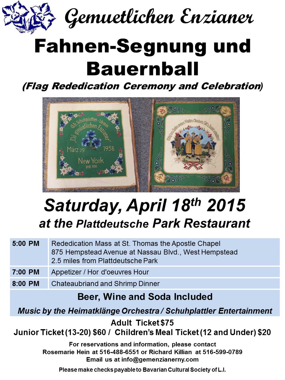 On behalf of the Gemütlichen Enzianer, we would like to extend an invitation to join us at our Fahnen-Segnung and Bauernball (Flag Rededication Celebration) on April 18, 2015. Our Club’s flag is an important symbol of our heritage and Trachten tradition and as such, the refurbishment and rededication of our flag is an important milestone in our club’s history.