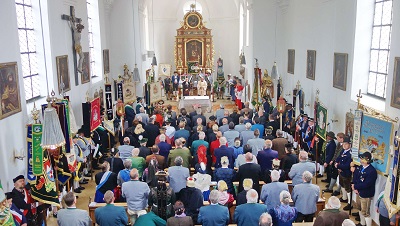 Photos: Church in Holzhausen -- the newly blessed Standard is in the center of the altar; Klaus, Teresa, and the Gau-NA flag are on the right side. Festzug back to the Kulturzentrum.
