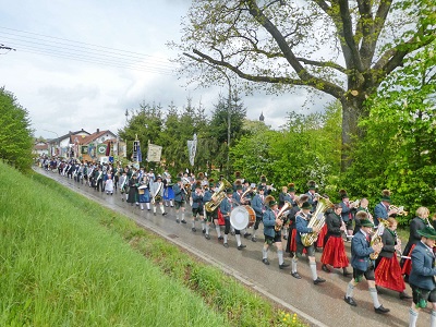 Gaufahnenträger Klaus Vikari and wife Teresa represented Gau-NA on May 4, 2019, at the Standartenweihe of the Bayerischer Trachtenverband in Holzhausen. The Trachtenverband was awarded a Standard in November at the celebration of 100 years of Freistaat Bayern. Bavaria's Minister-präsident Dr. Markus Söder invited the leaders of the many volunteer groups throughout Bayern that help give the state its unique culture to a festive reception where numerous volunteer organizations were awarded the beautiful Standards. The Bayerischer Blasmusikverband was the Pate at the Weihe last weekend, with each of the 22 Bavarian Gauverbände, the Austrian Verband, and Gau-NA also attending the blessing at the church in village of Holzhausen. Gau-NA had the honor of standing at the altar, and Teresa attached our Fahnenband to the Standard. Following the church service, the Trachtler and Trachtlerinnen were part of a Festzug back to the Kulturzentrum for a festive reception with music and the exchange of Fahnenbänder. Klaus did us proud with a speech to those assembled and accepted an Urkunde from the Verband on Gau-NA's behalf.