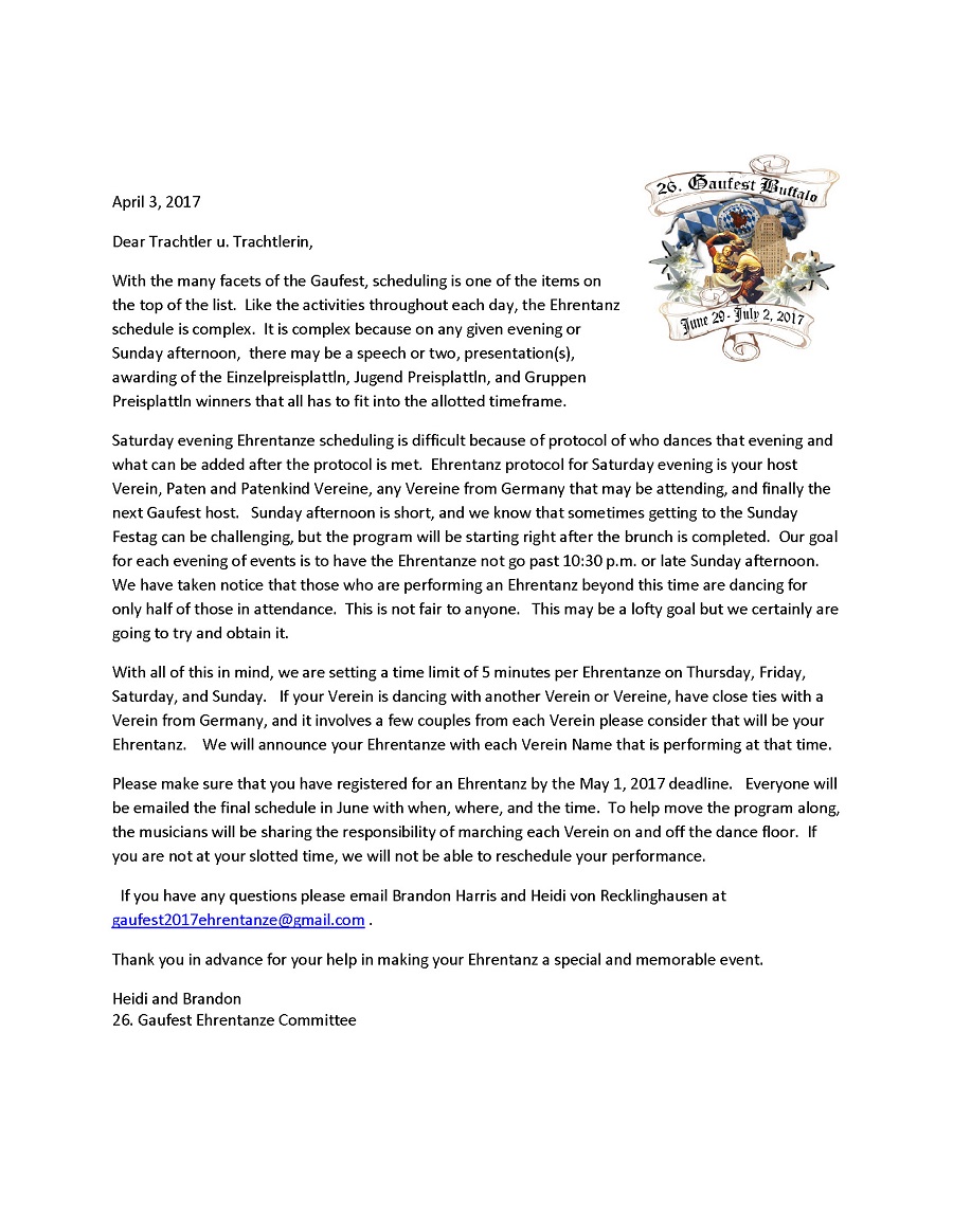 Please read the letter below issued by our Gaufest host Verein, SGTV Edelweiss Buffalo, about Ehrentänze. Note that Ehrentanz forms are due by May 1.