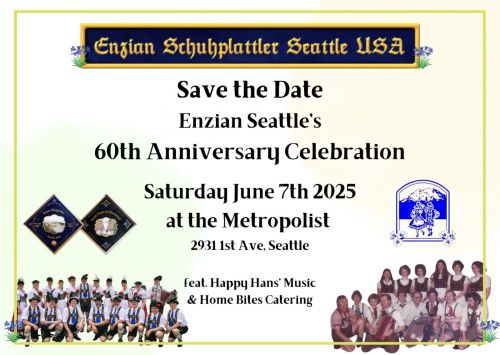 Enzian Seattle will be celebrating its 60th anniversary on June 7 with a gala evening of fun. More info is on the attached flyer. Or go to Enzian's website at Enzian Schuhplattler.