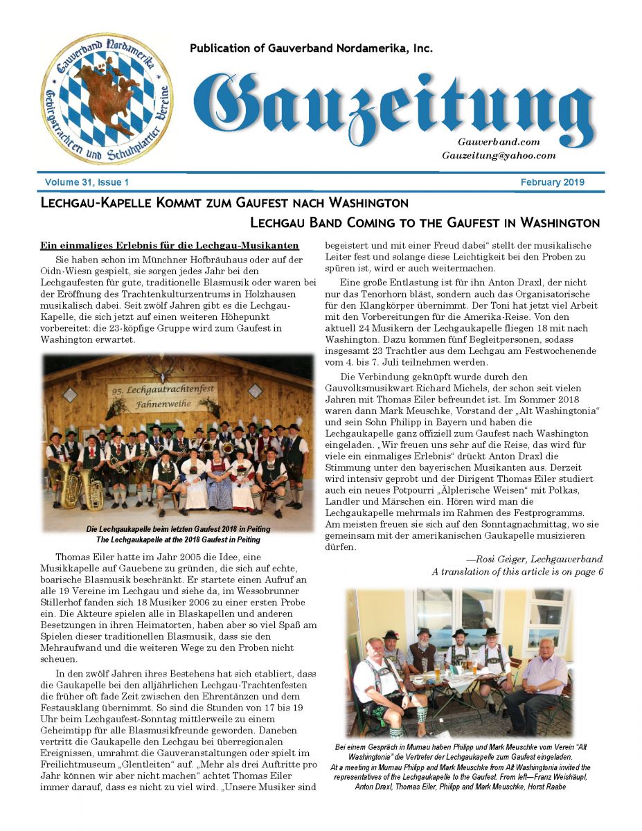 Gauzeitung The "Gauzeitung" is the official publication of the Gauverband Nordamerika. It includes articles on many cultural aspects of Bavaria and Tirol, reports from the Gauverband officers, stories from member Vereine about their events such as Fahnenweihen, tours to Germany, and club anniversaries. A subscription to the Gauzeitung costs $25 for an individual newsletter mailed directly to the subscriber. Vereine may purchase group subscriptions for $15 each, minimum of 5 subscriptions. Advertising space is also available. Contact the Gauverband's Pressewart for more information. Click on title above to read more about the Gauzeitung, see index of previous issues, and link to previous issues.