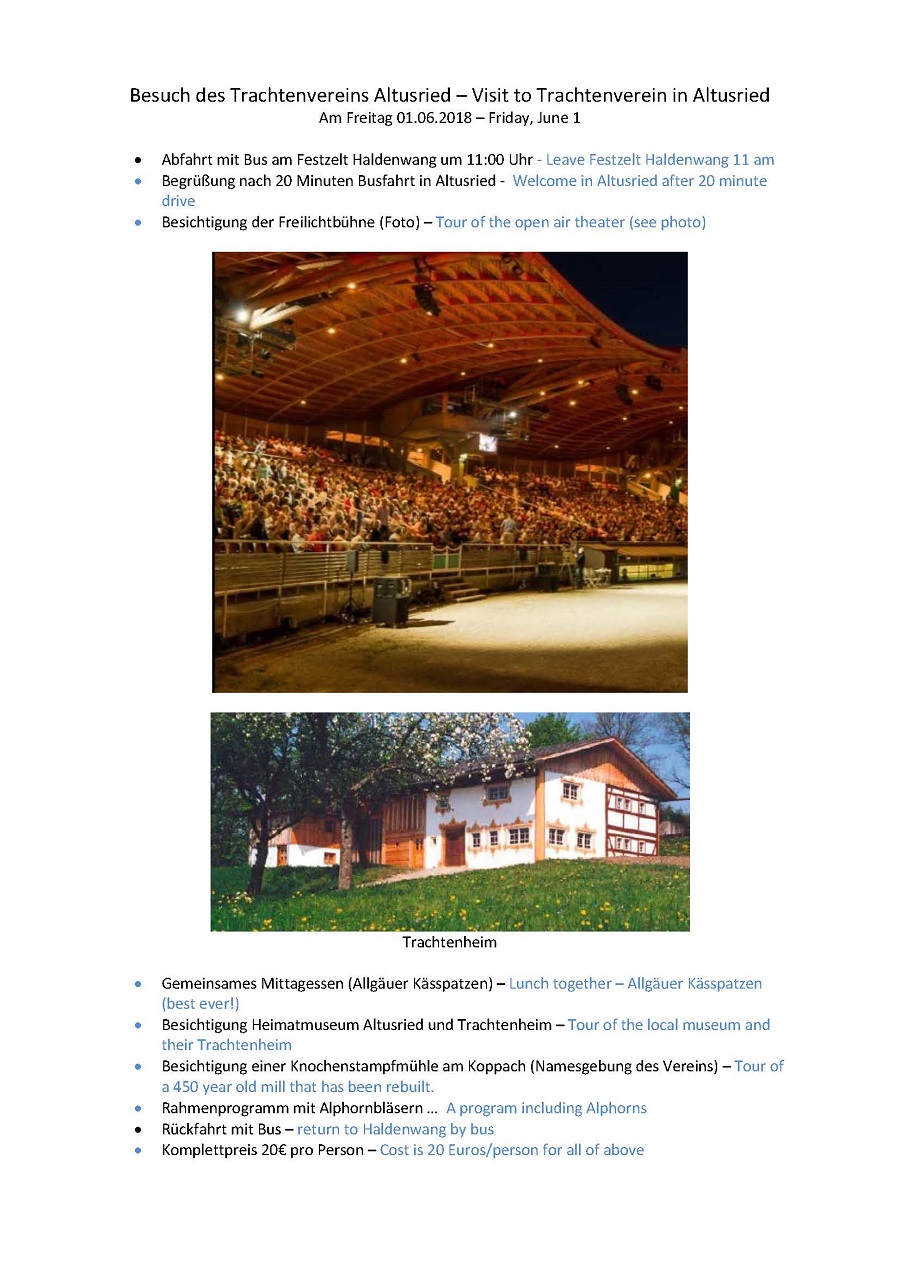 Those going to the Bayerischer Löwe/Allgäuer Gaufest are being offered a wonderful opportunity to get to know more Trachtler in the Allgäu, see interesting sights, eat Kässpätzen, hear Alphorns, and visit a Vereinsheim. D’Wageggler’s neighboring Trachtenverein--Koppachtaler Altusried--has a great excursion planned for us on Friday. A bus will leave the Festzelt in Haldenwang at 11 am, taking us to Altusried 20 minutes away. Members of the Verein will take us on a tour of the renowned Freilichtbühne, an open air theater that seats 2500 people. It is the site of a play about the history of the Allgäu that has been performed yearly for 135 years as well as numerous musical and theater productions. We’ll go back to their Trachtenheim to enjoy lunch together—Allgäuer Kässpatzen, a delicious specialty of the area. After that they'll give a tour of their Heimatmuseum showing the area’s history and culture and spend some time in their Trachtenheim. From there, a tour of a 450-year-old restored and rebuilt mill that is along the Koppach river will be our last stop. Included will be a short program that includes an Alphorn performance. Cost of this tour is 20 Euros/person. Please take advantage of this special afternoon to spend with fellow Trachtenkameraden. They are excited to welcome us! Let Rudy Leschke know if you’d like to attend (rjleschke@att.net). See the flyer below or click here to download it. Link to Website about Altusried
